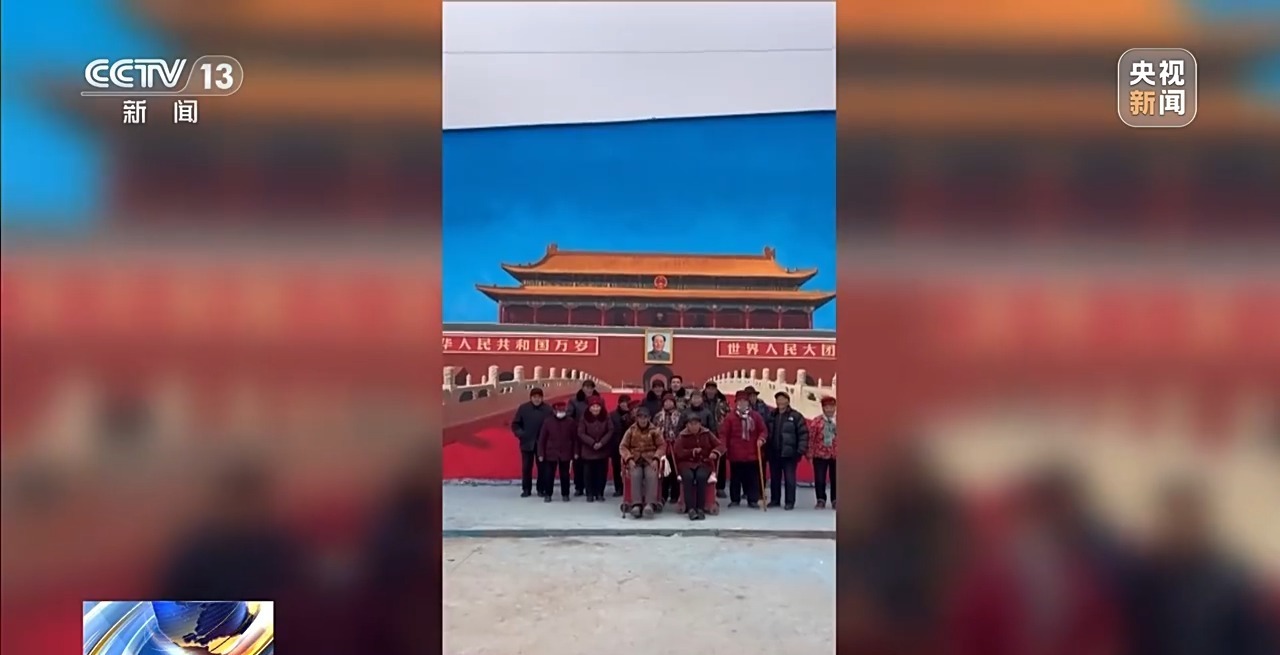 墙画完成的那天,村里老人们特意换上了最好的衣服,来到墙画前合影。